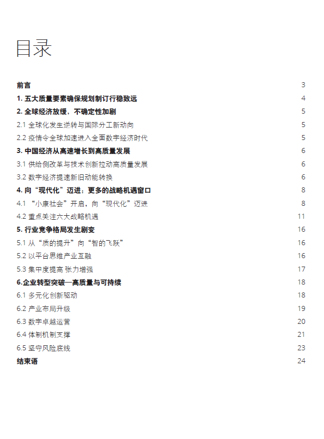 為了助力企業(yè)制訂高質(zhì)量的未來發(fā)展戰(zhàn)略,我們建議企業(yè)考慮以國際化、前瞻性、創(chuàng)新性、整合性和實操性為關(guān)鍵質(zhì)量評價要素。后續(xù)章節(jié)會探索未來全球經(jīng)濟環(huán)境以及國際分工的新動向,分析中國宏觀經(jīng)濟發(fā)展趨勢,幫助企業(yè)前瞻未來更長遠的環(huán)境變化;辨識未來需要關(guān)注的重要議題和戰(zhàn)略機遇;從全球視角和區(qū)域視角審視企業(yè)所處行業(yè)競爭格局的變化,洞察企業(yè)轉(zhuǎn)型突破的重要方向,力求以技術(shù)、管理和商業(yè)模式創(chuàng)新重新進行價值定位,實現(xiàn)可持續(xù)和高質(zhì)量的發(fā)展。