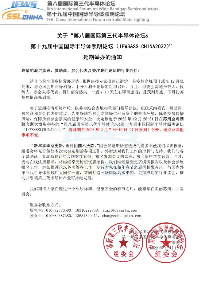 鑒于近期疫情形勢嚴峻,組委會結(jié)合當(dāng)?shù)叵嚓P(guān)部門指導(dǎo)建議,積極采納嘉賓、贊助商、參展商和參會代表的建議,為更好地給參會嘉賓提供舒適安全的交流環(huán)境,降低疫情傳播風(fēng)險,保障所有參會嘉賓的健康和安全,決定原定于2022年12月28-31日在蘇州金雞湖凱賓斯大酒店舉辦的“第八屆國際第三代半導(dǎo)體論壇&第十九屆中國國際半導(dǎo)體照明論壇(IFWS&SSLCHINA2022)” 將延期至2023年2月7日-10日(7日報到)召開,地點及其他事項不變。