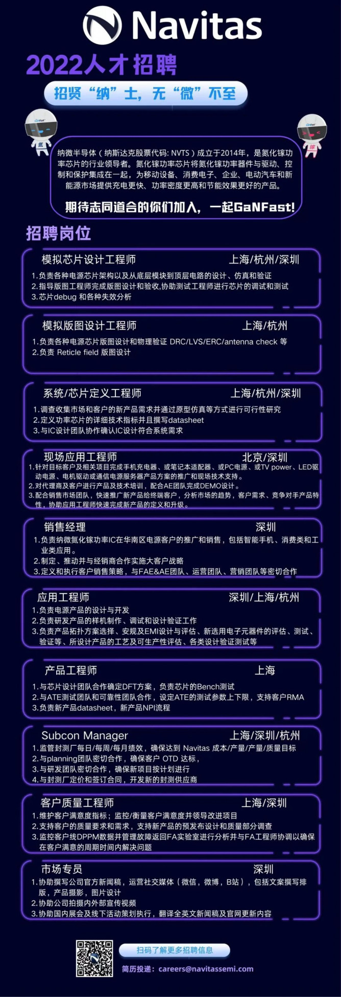 招賢納士,無微不至!納微半導(dǎo)體深圳,上海,杭州,北京辦公室火熱招聘中。納微芯球,等你加入!簡歷投遞:careers@navitassemi.com ,前往納微半導(dǎo)體官網(wǎng)提交。