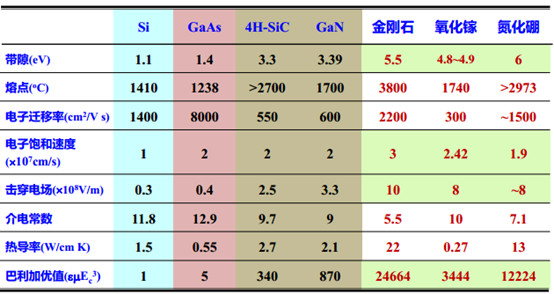 第三代半導(dǎo)體是以碳化硅SiC、氮化鎵GaN為主的寬禁帶半導(dǎo)體材料,具有高擊穿電場(chǎng)、高飽和電子速度、高熱導(dǎo)率、高電子密度、高遷移率、可承受大功率等特點(diǎn)。