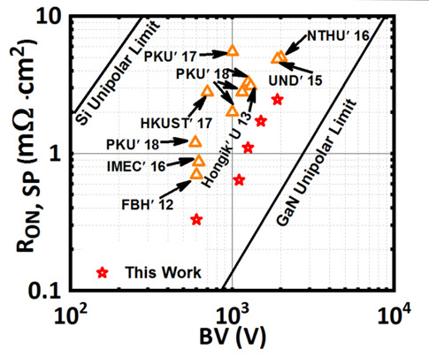 2018 年,西安電子科技大學(xué)在氮化物電力電子器件氣的重要進(jìn)展,研制成功一個(gè)新結(jié)構(gòu)GaN肖特基微波功率二極管,禁帶寬度很寬,但開(kāi)啟電壓非常低(0.35 V,與硅相近),GaN SBD目前最好的BV~Ron,更靠近GaN Baliga理論曲線(圖6)。