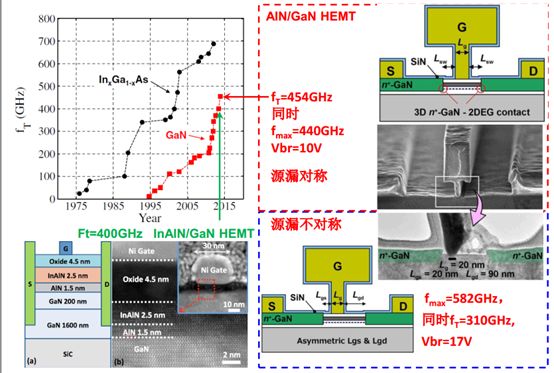 目前454GHz的AlN/GaN HEMT源漏對(duì)稱器件最高fT為454 GHz,同時(shí)fmax達(dá)到了440 GHz,就是說(shuō)如果該器件正常工作到THz階段,對(duì)于200 GHz的工作頻率還是有保障的。