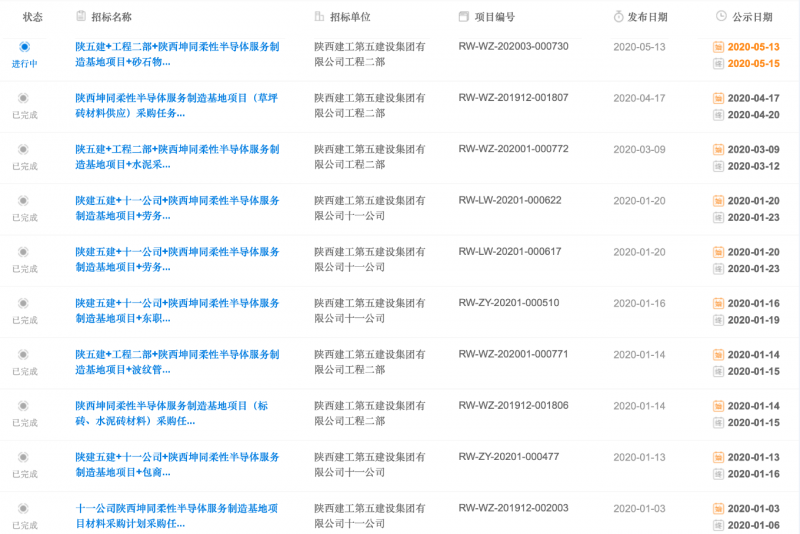 陜西坤同項目的工程總包方為陜西建工控股集團(下簡稱‘陜西建工’)。2019年9月10日,陜西建工與陜西坤同簽署合作協(xié)議,就共同推動陜西坤同柔性半導體服務制造基地項目建設達成協(xié)定。