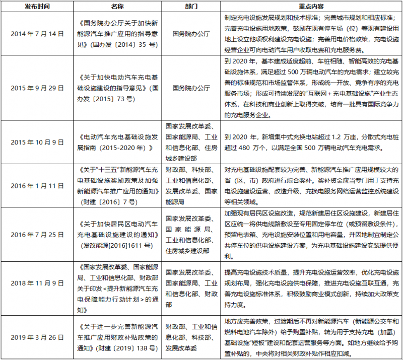 自2014年起,中央政府部門(mén)發(fā)布了一系列涉及新能源充電樁項(xiàng)目(即新能源汽車充電基礎(chǔ)設(shè)施)建設(shè)的政策文件,其中部分重點(diǎn)文件如下: