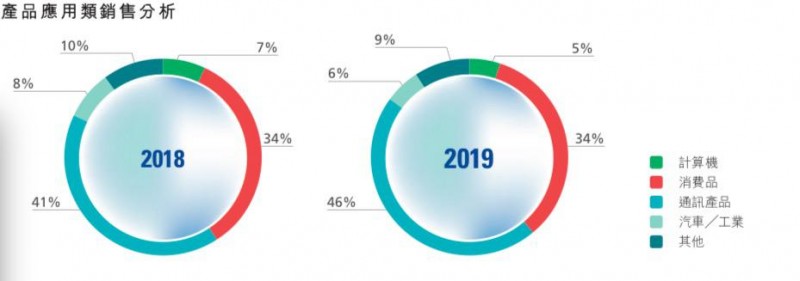 按照應(yīng)用領(lǐng)域劃分,通訊應(yīng)用的收入占2019年總收入的46%,消費者應(yīng)用34%,計算機應(yīng)用5%,汽車及工業(yè)應(yīng)用6%,其他相關(guān)應(yīng)用9%。