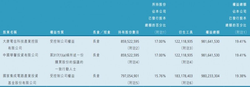 根據(jù)中芯國際財報,截止2019年12月31日,中芯國際的第一大股東為大唐電信,持股17%,第二大股東為國家集成電路產(chǎn)業(yè)投資基金,持股15.76%。