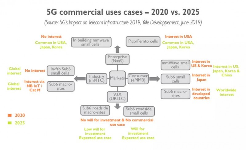 圖 1:據(jù)Yole Développement,到2025年,各種5G商業(yè)應(yīng)用將使用在最合適的頻段,主流為sub-6 GHz的宏基站和小基站。[2]