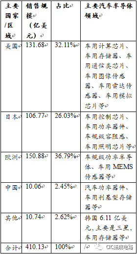 表1:汽車半導(dǎo)體產(chǎn)業(yè)主要國(guó)家/區(qū)域市場(chǎng)份額占比及主要汽車半導(dǎo)體領(lǐng)域
