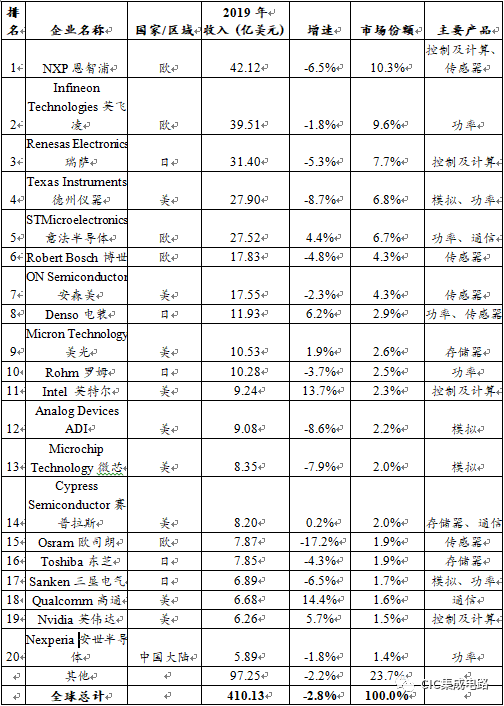 表3:全球前20大汽車半導(dǎo)體企業(yè)列表