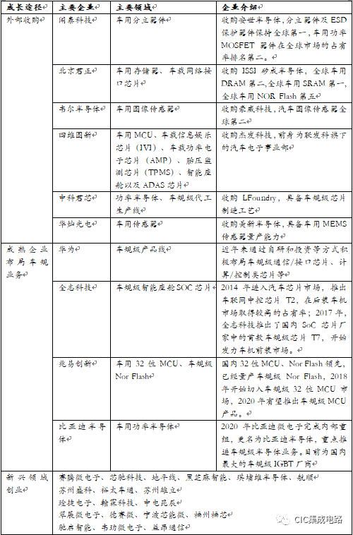 近年來(lái),我國(guó)企業(yè)通過(guò)收購(gòu),將海外優(yōu)質(zhì)汽車半導(dǎo)體資產(chǎn)進(jìn)行整合,為國(guó)產(chǎn)替代打開(kāi)成長(zhǎng)空間,成為我國(guó)汽車半導(dǎo)體產(chǎn)業(yè)快速發(fā)展的主要驅(qū)動(dòng)力。而部分在消費(fèi)級(jí)半導(dǎo)體領(lǐng)域做強(qiáng)做大的成熟企業(yè),也在逐步開(kāi)拓車規(guī)級(jí)市場(chǎng)的業(yè)務(wù)。同時(shí)部分國(guó)內(nèi)傳統(tǒng)汽車廠商也開(kāi)始注重產(chǎn)業(yè)鏈上下游延拓,積極布局汽車半導(dǎo)體產(chǎn)業(yè)。另外在ADAS、智能網(wǎng)聯(lián)這些汽車半導(dǎo)體新興領(lǐng)域,國(guó)內(nèi)汽車半導(dǎo)體初創(chuàng)企業(yè)不斷涌現(xiàn)。外部收購(gòu)、成熟企業(yè)布局車規(guī)半導(dǎo)體業(yè)務(wù)、以及新興領(lǐng)域創(chuàng)業(yè),成為目前支撐我國(guó)汽車半導(dǎo)體發(fā)展的主要路徑。