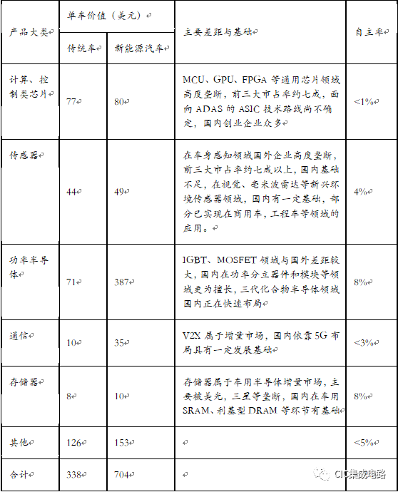 表5:我國(guó)汽車半導(dǎo)體在各領(lǐng)域的差距和自主率情況