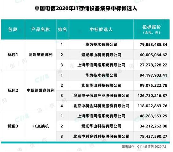 來自中國電信官網(wǎng)消息,中國電信2020年IT存儲設備集中采購項目結果出爐。最終,華為、紫光華山、上海華訊、浪潮、中科金財5家廠商入圍。