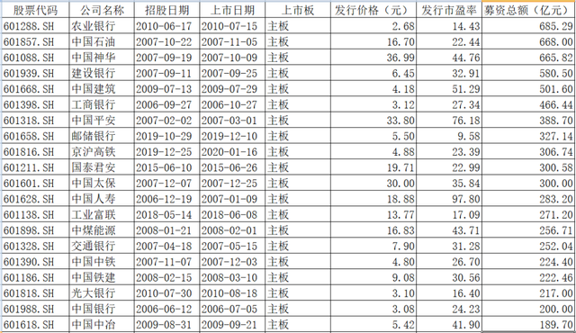 A股歷史IPO募資額排名居前的公司 數(shù)據(jù)來源:Wind