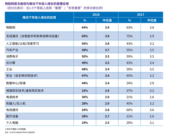 今年全球物聯(lián)網(wǎng)技術(shù)開支將達(dá)到7,450億美元,2022年將達(dá)到1.2萬(wàn)億美元。由于對(duì)收入增長(zhǎng)的關(guān)注,半導(dǎo)體公司正大舉押注于物聯(lián)網(wǎng)。在我們的調(diào)查中,受訪者首次將物聯(lián)網(wǎng)(包括聯(lián)網(wǎng)住宅、智慧城市、工業(yè)物聯(lián)網(wǎng)和個(gè)人可穿戴設(shè)備)列為下一財(cái)年推動(dòng)半導(dǎo)體行業(yè)收入增長(zhǎng)最具重要性的應(yīng)用,其次是無(wú)線通信(去年排在第一位)。