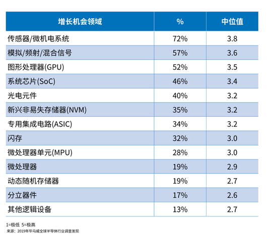 半導(dǎo)體公司,特別是小型半導(dǎo)體公司預(yù)計(jì)今后傳感器/微機(jī)電系統(tǒng)領(lǐng)域?qū)⒋嬖诖罅繖C(jī)遇,因?yàn)檫@些無(wú)處不在的商品化技術(shù)不需要大規(guī)?;蝾I(lǐng)先的生產(chǎn)工廠。72%的受訪者、近80%的小公司將其列為2019年半導(dǎo)體行業(yè)增長(zhǎng)最快的領(lǐng)域。