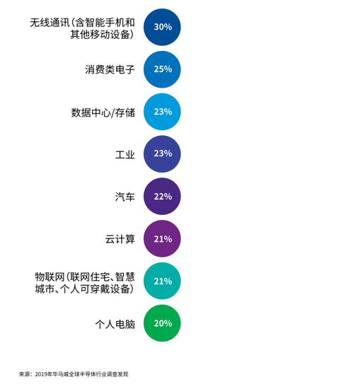 多年來(lái),無(wú)線通信市場(chǎng)的一大推動(dòng)力是智能手機(jī)用戶的空前增長(zhǎng)。如今隨著移動(dòng)設(shè)備終端用戶滲透率接近見頂,無(wú)線通信市場(chǎng)的增長(zhǎng)空間更小。不過(guò)無(wú)線通訊仍然是一個(gè)健康的市場(chǎng),仍然是推動(dòng)半導(dǎo)體行業(yè)增長(zhǎng)的第二重要領(lǐng)域。受訪者預(yù)計(jì),無(wú)線通訊將占公司下一財(cái)年收入的30%,在全部應(yīng)用領(lǐng)域中占比最高。