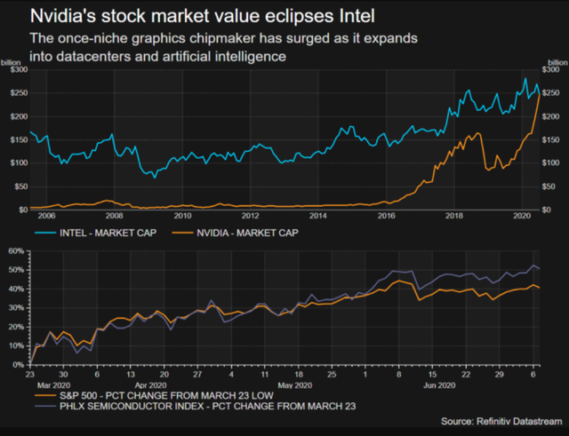 今年至今,英特爾的股價(jià)下跌了近3%,NVIDIA的股價(jià)則飆升68%。由于新冠病毒疫情導(dǎo)致遠(yuǎn)程工作成為趨勢(shì),市場(chǎng)對(duì)NVIDIA產(chǎn)品的需求變大。