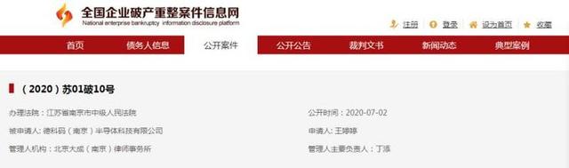 從全國(guó)企業(yè)破產(chǎn)重整案件信息網(wǎng)公布的信息了解到,今年5月13日,南京德科碼申請(qǐng)破產(chǎn)審查,7月2日,申請(qǐng)破產(chǎn)。