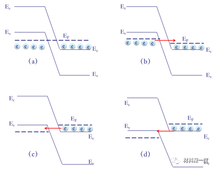 圖1 江崎二極管電流-電壓性質(zhì):(a)平衡態(tài),費米能級進入到n型區(qū)導(dǎo)帶和p型區(qū)價帶內(nèi);(b)反偏壓下,p型區(qū)價帶電子可隧穿至能量等效的n型區(qū)導(dǎo)帶空態(tài);(c)正偏壓下,n型區(qū)導(dǎo)帶電子可隧穿至能量等效的p型區(qū)價帶空態(tài);(d)增加正偏壓,使n型區(qū)導(dǎo)帶底邊和p型區(qū)價帶頂邊能量相等位置,則無隧穿發(fā)生,隧穿電流降至最少。