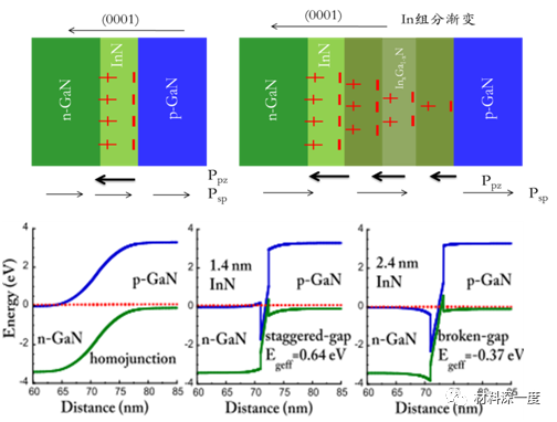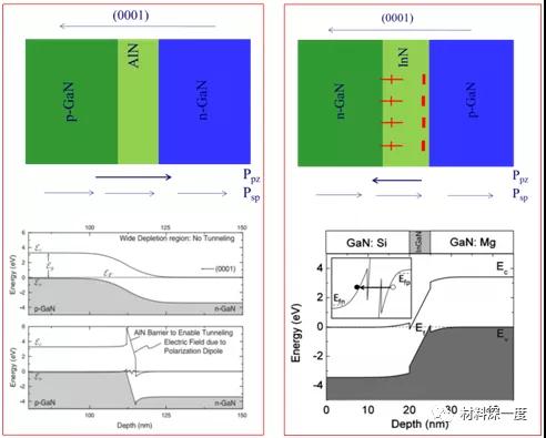 圖5GaN基隧穿二極管示意圖:通過InN插入層,或者更加精細復(fù)雜的In組分漸變多InGaN層等極化工程,可以增加隧穿概率。