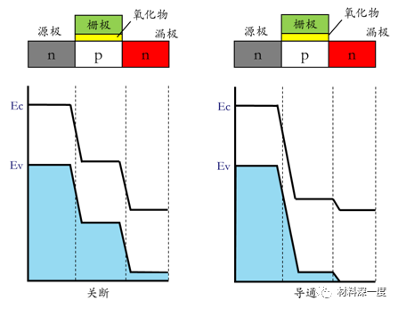 圖4隧穿場效應(yīng)晶體管(TFETs)工作原理:左,無隧穿電流,TFETs關(guān)斷狀態(tài);右,加?xùn)艍汉螽a(chǎn)生隧穿電流,TFETs導(dǎo)通。