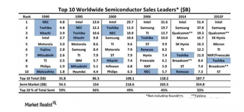 1990—2005年前十大半導(dǎo)體排名(圖源:IC insights)