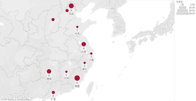 其分布情況如下:福建6個(gè)、北京5個(gè)、湖南4個(gè)、江蘇4個(gè)、廣東2個(gè)、河北2個(gè)、山西1個(gè)、江西1個(gè)、山東1個(gè)、上海1個(gè)、浙江1個(gè)。