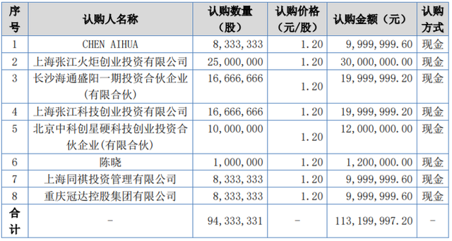 根據(jù)“中晟光電設(shè)備(上海)股份有限公司股票定向發(fā)行認(rèn)購結(jié)果公告”,除領(lǐng)投方浦東科創(chuàng)集團(tuán)之外,參與認(rèn)購還有海通盛陽、張江科投、中科創(chuàng)星、同祺投資、重慶冠達(dá),中晟光電董事長兼總經(jīng)理CHEN AIHUA(陳愛華)、副總經(jīng)理陳曉等。