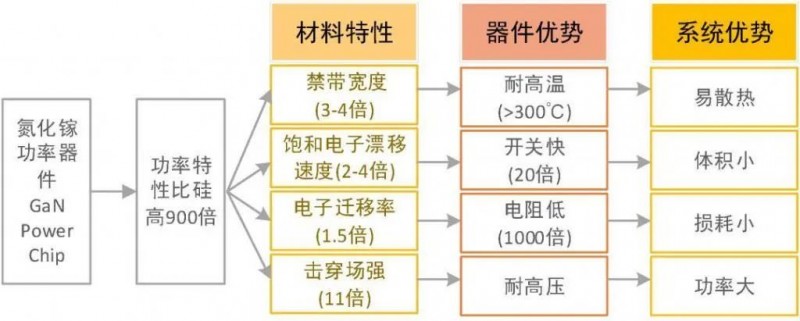 從數(shù)據(jù)顯示,氮化鎵比硅禁帶寬度大 3 倍,擊穿場強高 10 倍,飽和電 子遷移速度大 3 倍,熱導率高 2 倍。這些性能提升帶來一些的優(yōu)勢就是氮化鎵比硅更適合做大功率高頻的功率器件,同時體積還更小,功率密度還更大。
