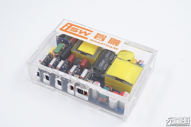 智融200W 4C2A氮化鎵快充參考設(shè)計(jì)整體使用透明亞克力外殼封裝,內(nèi)部輸入端集成了PFC功率因數(shù)校正電路,并采用開關(guān)電源+二次降壓的輸出架構(gòu)。