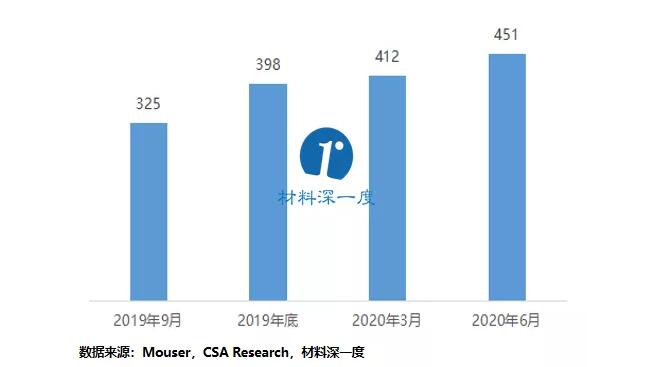 圖1 2019年-2020年Q2 Mouser在售的GaN器件及模塊產(chǎn)品數(shù)量情況(款)