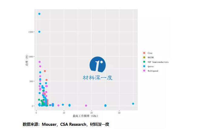 RF GaN HEMT的工作頻率創(chuàng)新高。本季度Qorvo的1款產(chǎn)品的頻率達(dá)到了35GHz,而上季度產(chǎn)品最高工作頻率為25GHz。在功率方面還未有新的突破,輸出功率最高達(dá)到1862W(1.0-1.1GHz,由Qorvo生產(chǎn))。