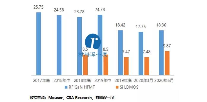 圖5 2017年-2020年Q2 RF GaN HEMT和Si LDMOS平均價格(元/W)