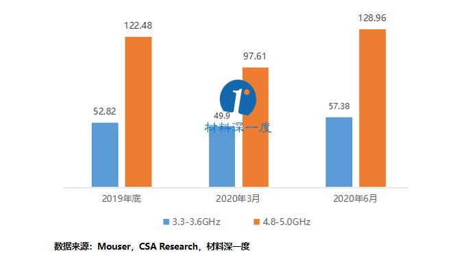 2020年Q2 ,在3.3-3.6GHz頻率段的GaN功率放大器產(chǎn)品的平均價格(57.38元/W)與Q1(49.9元/W)相比增長了15%;產(chǎn)品工作頻率在4.8-5.0GHz頻率段的產(chǎn)品,其平均價格(128.96元/W)與Q1(97.61元/W)相比增長了32%。