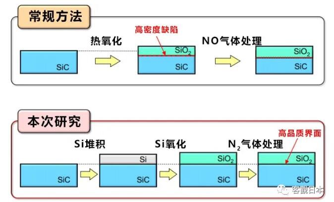圖1:形成SiO2/SiC結(jié)構(gòu)的方法模式圖(上:常規(guī)方法,下:此次研究提出的方法)