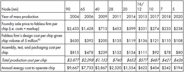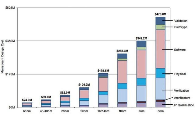 之所以先進(jìn)制程芯片的成本不斷增加,不可忽視的是半導(dǎo)體制造設(shè)備成本每年增加11%,每顆芯片的設(shè)計成本增加24%,其增長率都高于半導(dǎo)體市場7%的增長率。