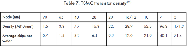 假設(shè)5nm GPU的芯片面積為610平方毫米,并且晶體管密度比P100 GPU高,達(dá)到907億個晶體管。下表中是用模型估算的臺積電90至5nm之間的節(jié)點晶體管密度。在90至7nm范圍內(nèi)的節(jié)點,模型使用具有相同規(guī)格的假想GPU,包括晶體管除晶體管密度,假想的5nm GPU與假設(shè)節(jié)點關(guān)聯(lián)。