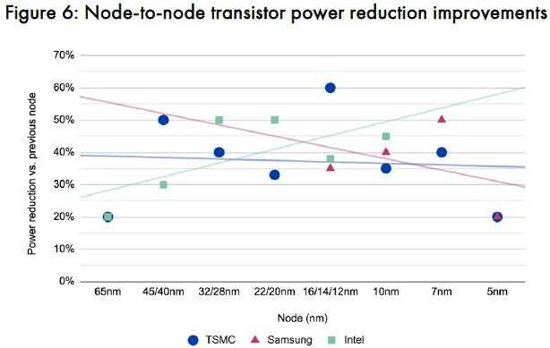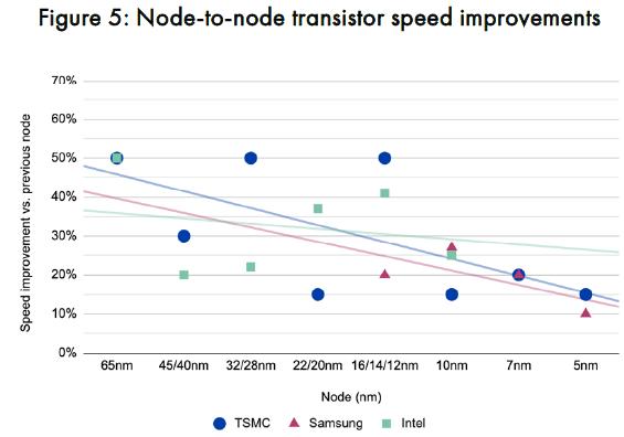 報告中指出,臺積電聲稱的節(jié)點進(jìn)步帶來的速度提升和功耗降低,從90 nm和5 nm之間以恒定比例變化,但趨勢趨于平穩(wěn)。三星兩種指標(biāo)在14 nm和5 nm之間都有下降趨勢,但缺少大于14 nm的節(jié)點處的數(shù)據(jù)。