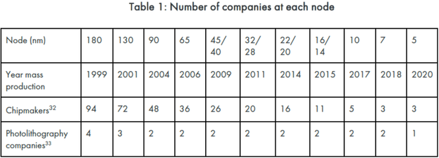 下表給出了每個工藝節(jié)點量產(chǎn)的時間以及代工廠的數(shù)量,可以看到,隨著制程的向前推進(jìn),晶圓代工廠數(shù)量越來越少。目前先進(jìn)的制程工藝代工廠僅剩臺積電、三星和英特爾。