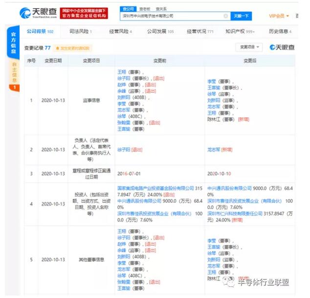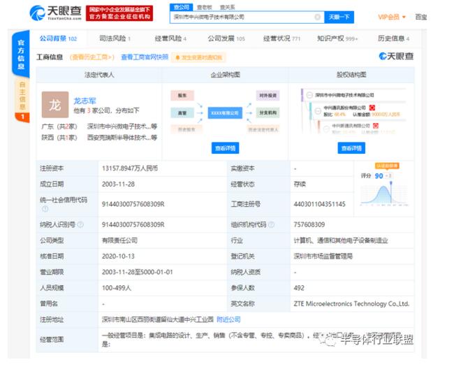 深圳市中興微電子技術有限公司成立于2003年11月,法定代表人為龍志軍,注冊資本約1.32億人民幣,經(jīng)營范圍含集成電路的設計、生產、銷售等。