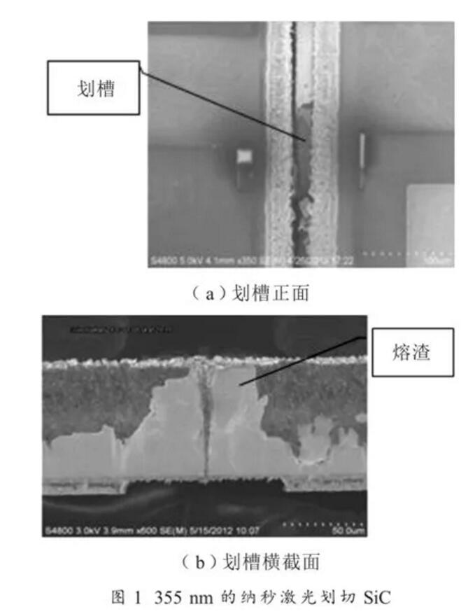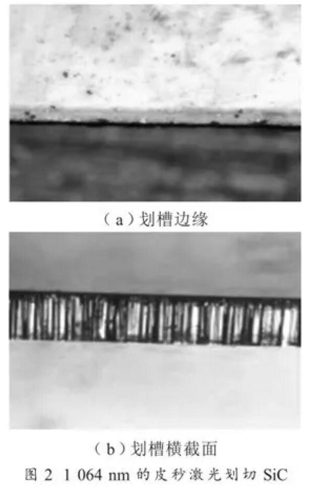 目前,激光劃片設(shè)備采用工業(yè)激光器,波長(zhǎng)主要有 1 064 nm、532 nm、355 nm 三種,脈寬為納秒、皮秒和飛秒級(jí)。理論上,激光波長(zhǎng)越短、脈寬越短,加工熱效應(yīng)越小,有利于微細(xì)精密加工,但成本相對(duì)較高。355 nm 的紫外納秒激光器因其技術(shù)成熟、成本低、加工熱效應(yīng)小,應(yīng)用非常廣泛。近幾年 1 064 nm 的皮秒激光器技術(shù)發(fā)展迅速,應(yīng)用到很多新領(lǐng)域,獲得了很好的效果。圖 1、圖 2 分別對(duì) 2 種激光器劃切 SiC 晶圓的效果進(jìn)行了對(duì)比。
