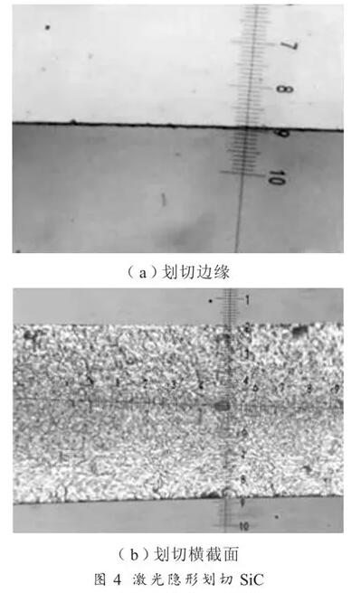 碳化硅材料解理性差,改質(zhì)層的間隔不能太大。試驗(yàn)采用 JHQ-611 全自動(dòng)劃片機(jī)和 350 μm厚的 SiC 晶圓,劃切 22 層,劃切速度 500 mm/s,裂開(kāi)后的斷面比較光滑,崩邊小,邊緣整齊,如圖4 所示。