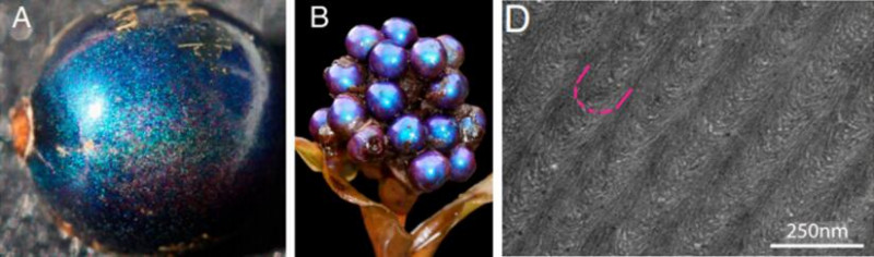 圖1 Pollia condensata,被譽(yù)為科學(xué)界已知色彩最鮮艷的果實(shí),其顏色主要源自最外層的螺旋cellulose microfibrils陣列,具有手型特征:比如左旋光入射,反射光變?yōu)橛倚猓?5712–15715| PNAS| September 25, 2012 |vol. 109 | no. 39)。