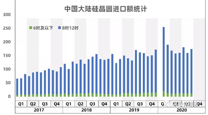 硅晶圓是半導(dǎo)體制造過程中最重要也是金額占比最高的材料,而我國目前對進(jìn)口的硅晶圓,尤其是12吋高端產(chǎn)品依賴很高,進(jìn)口量直接反映了大陸的半導(dǎo)體產(chǎn)能變化。