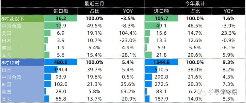 由下圖可見,我國進(jìn)口的硅晶圓金額在最近幾年一直呈現(xiàn)明顯的增長趨勢,反映了我國大陸半導(dǎo)體產(chǎn)能的蓬勃發(fā)展。而進(jìn)口硅晶圓的總金額中以8吋和12吋晶圓為主。這說明我國在高端硅晶圓領(lǐng)域?qū)τ谶M(jìn)口產(chǎn)品的依賴偏重。