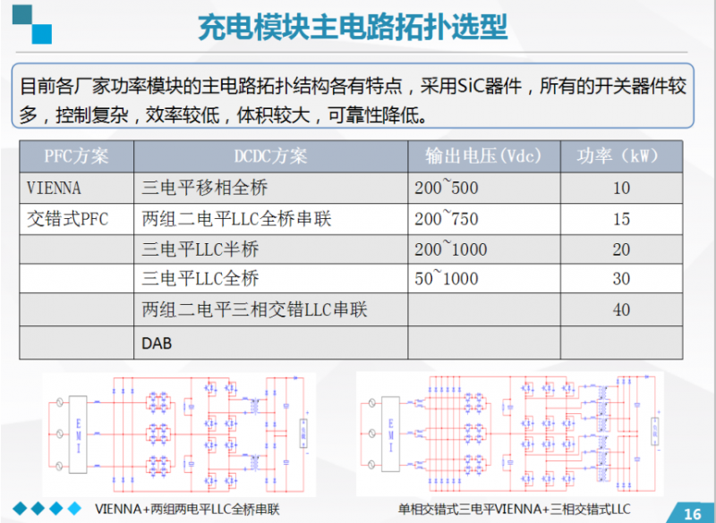 SiC器件應(yīng)用成效來看,20kW全碳化硅充電模塊的前級(jí)AC/DC采用三相PWM整流電路,1200V/40mΩ器件并聯(lián),開關(guān)頻率35kHz,后級(jí)DC/DC采用兩電平交錯(cuò)并聯(lián)LLC電路,開關(guān)頻率120kHz~300kHz,峰值效率97.3%,滿載效率96.7%。