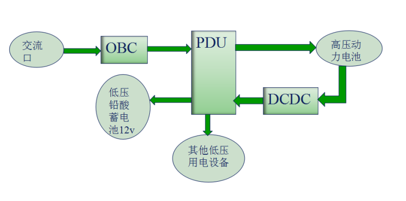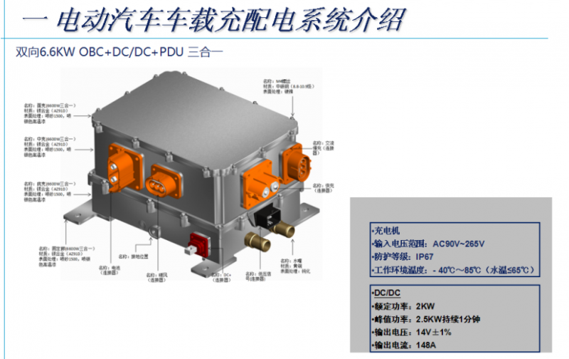 電動(dòng)汽車車載充配電系統(tǒng)一般包括三部分:車載充電機(jī)(OBC),車載高壓DCDC,車載功率配電系統(tǒng)(PDU)。按其組裝方式有單體,二合一,三合一。