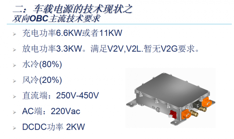 車載電源的技術(shù)現(xiàn)狀來(lái)看,對(duì)于傳統(tǒng)的以A00級(jí)車為主的市場(chǎng),其基本是以3.3KW的慢充和1KW左右的DCDC、風(fēng)冷為主。更快速度的充電要求+多樣化的電動(dòng)汽車出行任務(wù)產(chǎn)生了6.6KW和11KW的充電功率以及雙向放電逆變要求,并逐漸成為主流。更多的電動(dòng)汽車車載低壓電氣設(shè)備加入,比如ADAS、大屏幕顯示、按摩座椅等等,要求2.0KW及以上的DCDC模塊。AUTOSAR系統(tǒng),功能安全設(shè)計(jì)逐步導(dǎo)入中。