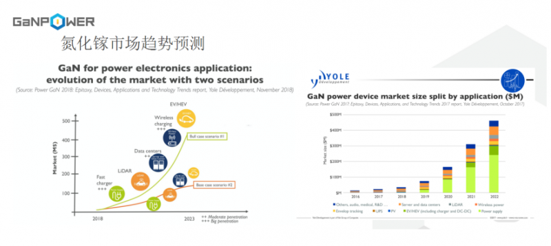 就氮化鎵市場趨勢來看,未來三年,氮化鎵功率器件主要在快充,激光雷達,數(shù)據(jù)中心,電動汽車及無線充電五個應(yīng)用方向。2023年全球氮化鎵功率市場預(yù)測在1.5億到4億美元之間。