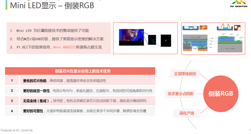 隨著LED顯示屏于娛樂、零售,遠(yuǎn)程會議,教育、醫(yī)療、安防等市場需求增加,小間距、超小間距顯示屏景氣度持續(xù)向好。報告指出,Mini LED RGB顯示技術(shù)作為小間距顯示屏的自然延伸,無論是下游應(yīng)用還是工藝技術(shù)均可無縫銜接,有望為LED顯示屏注入新的源頭活水。P1.1以下的顯示屏應(yīng)用,Mini LED 為主流芯片方案。